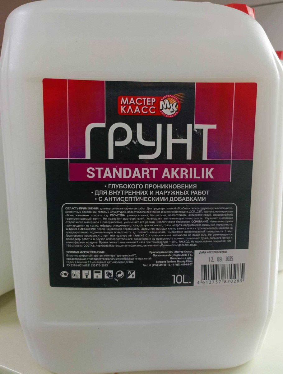 Грунт наносится в один–два слоя с помощью кисти с плотной щетиной, макловицы или валика с синтетическим ворсом. Повторное грунтование допускается через 30–40 минут. Нанесение последующих материалов возможно после полного высыхания грунта.