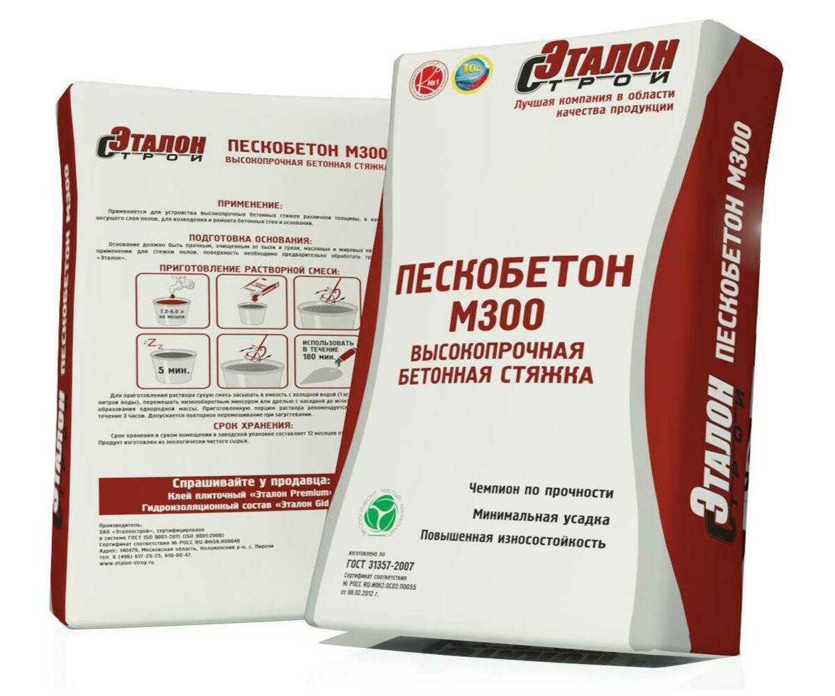 Бетонная стяжка «Эталон М-300 Пескобетон» предназначен для изготовления прочных бетонных стяжек различной толщины, для заливки фундаментов при обустройстве жилых, общественных и производственных помещений, гаражей, зон повышенного потока людей, при монтажно-кладочных работах, для возведения и ремонта бетонных стен и оснований. Обеспечивает высокое качество строительных работ. «Эталон М-300 Пескобетон» рекомендуется для выполнения высококачественного базового несущего слоя полов.