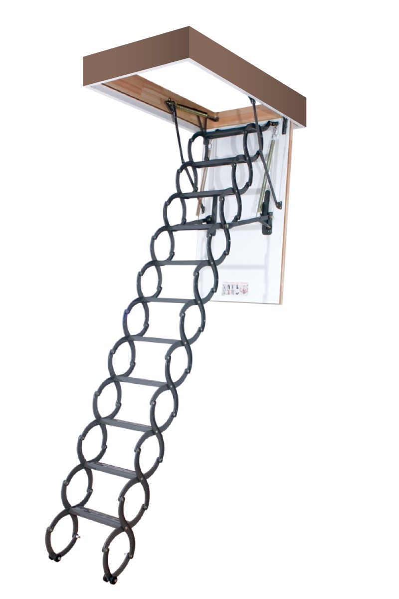 Металлическая чердачная лестница Fakro LST имеет «ножничную» систему складывания. Данный тип лестниц разработан специально для мест, где неудобно использование секционных лестниц. Кроме того, благодаря специальному механизму, открытие и складывание может происходить с помощью стержня. Поэтому такой тип чердачной лестницы рекомендуется для помещений с высокими потолками.